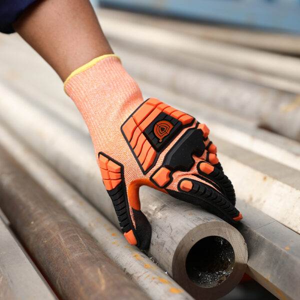 13G HPPE+Steel fiber+A6/F fiberglass palm dipped in friction glue, sewn TPR on top of glove